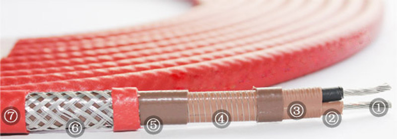 ① 鍍(du)錫圓銅線; ② 芯線絕緣層; ③ 內護(hu)套絕緣層; ④ 發熱絲; ⑤ 外(wai)護(hu)套; ⑥ 金屬編織層; ⑦ 加強護(hu)套;