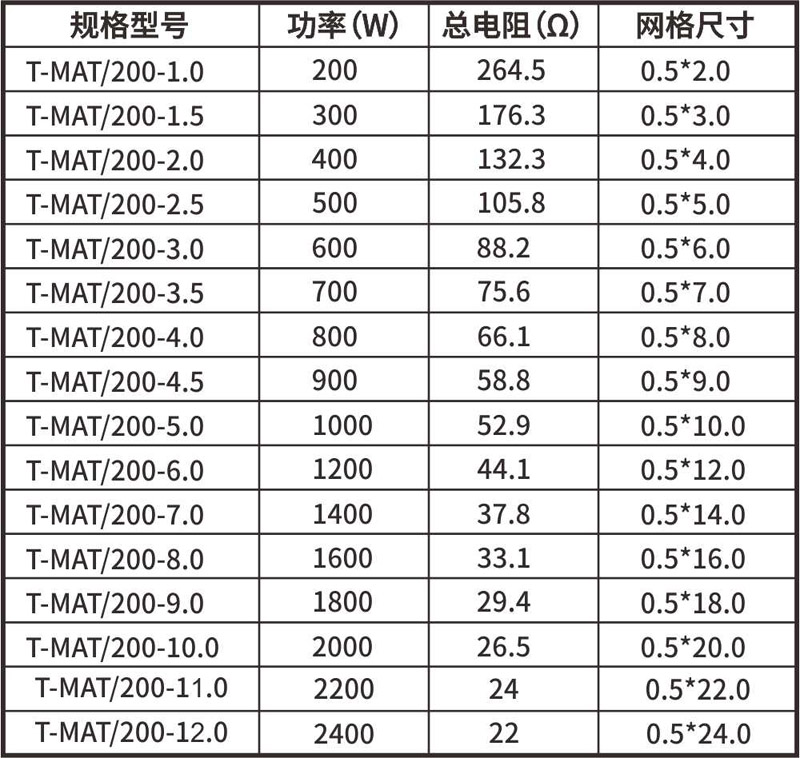 常用規(gui)格為100W/m2、150W/m2、200W/m2、240W/m2其(qi)它規(gui)格可以定(ding)制;