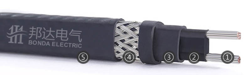 ① 發熱(re)芯;② 復合絕緣層(ceng); ③ 外(wai)護套; ④ 金屬編織層(ceng); ⑤ 加強(qiang)層(ceng)